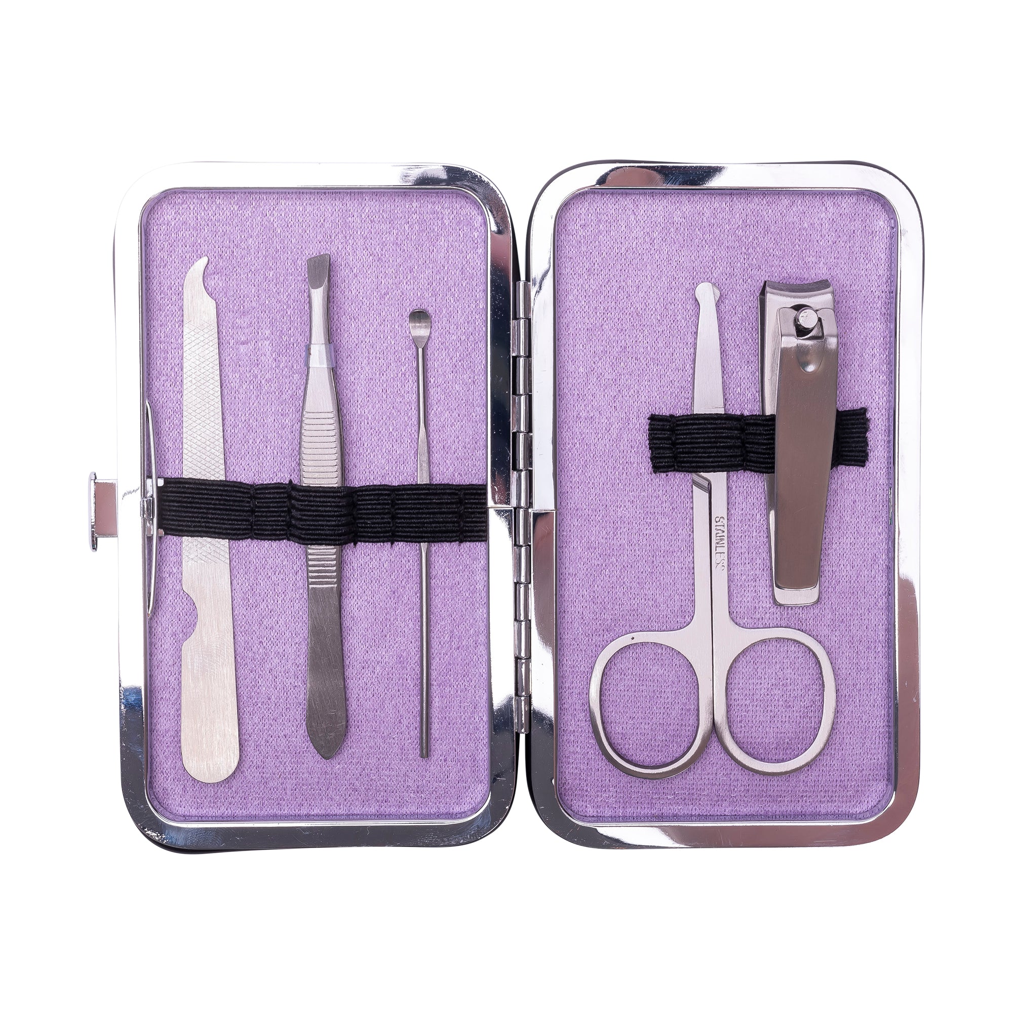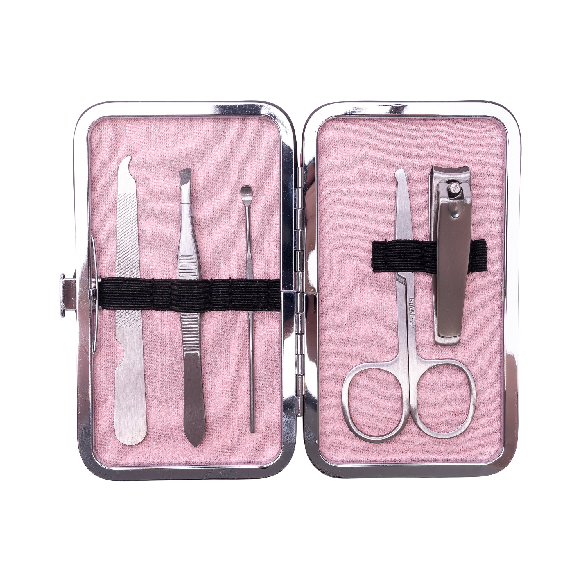 5 stainless steel tools: nail file, tweezers, cuticle tool, nail clippers, and cuticle scissors inside of a custom case